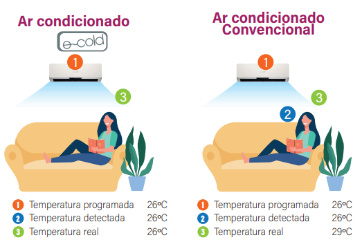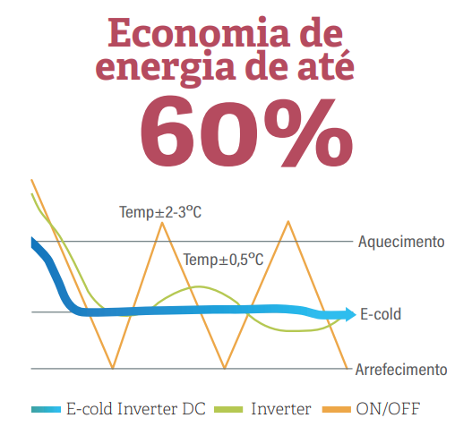 - Quando a temperatura do compartimento é alcançada ou se aproxima da temperatura selecionada, o equipamento de ar condicionado E-cold pode funcionar a uma velocidade mais baixa. Desta forma a troca de Aquecimento é mais eficiente, aumentando o COP o que resulta numa real economia energética.